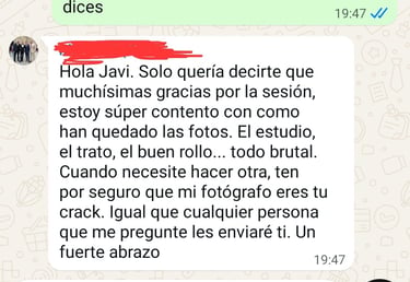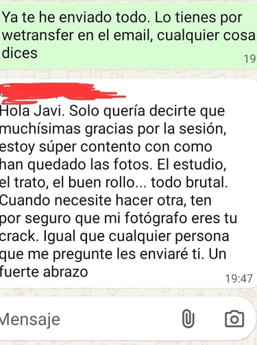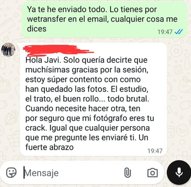 Hola Javi. Solo quería decirte que muchísimas gracias por la sesión, estoy super contento con como han quedado las fotos. El estudio, el trato, el buen rollo... todo brutal. Cuando...